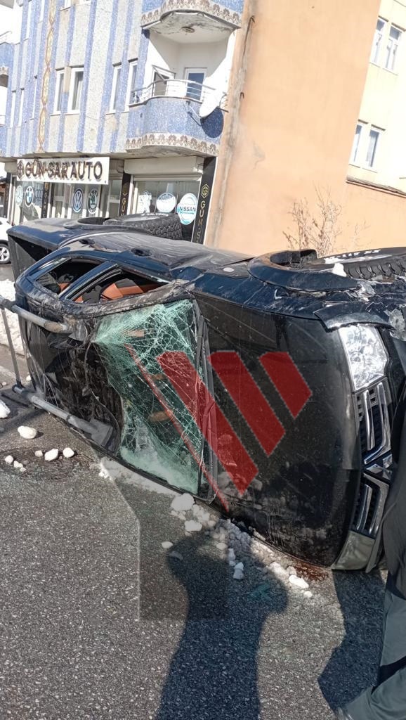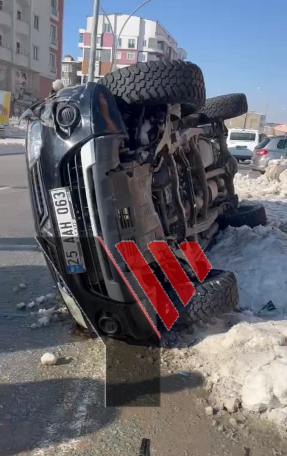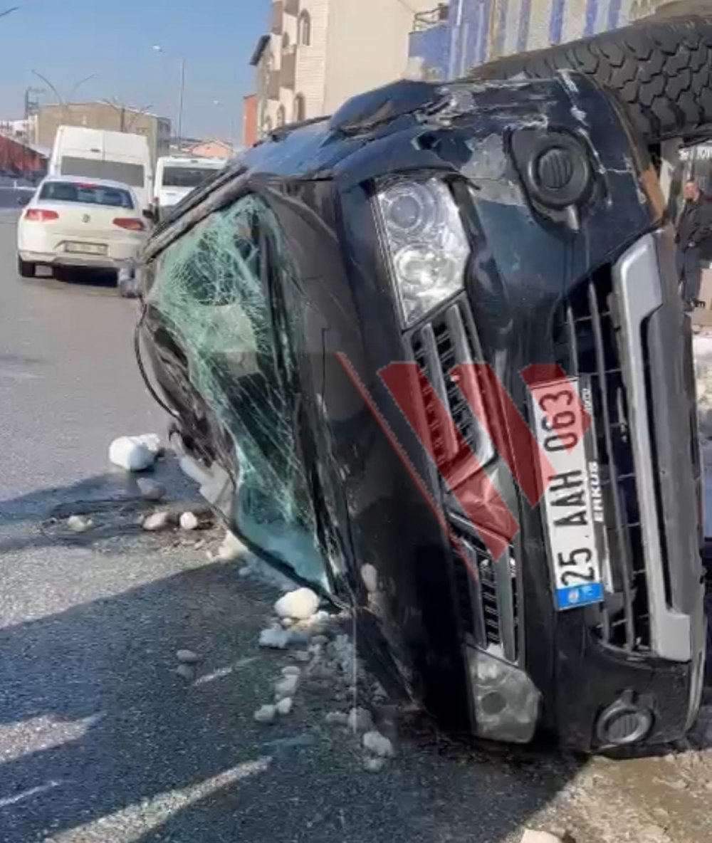 Sürücüsünün ismi öğrenilemeyen 25 AHH 063 plakalı kamyonet, yolun kaygan olmasından dolayı kontrolden çıkarak takla attı.