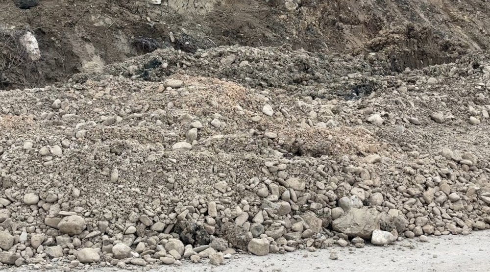 Belediye ekipleri, iş makineleriyle yola inen balçık ve kaya parçalarını kamyonlara yükleyerek tahliye çalışmalarını sürdürüyor.
