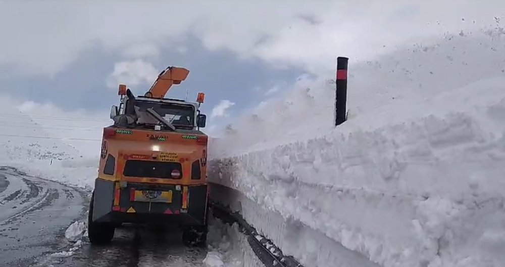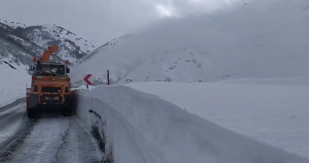 Kar kalınlığının yer yer 4 metreyi bulduğu yolu açan ekipler, yol genişletme çalışmalarına devam ediyor.