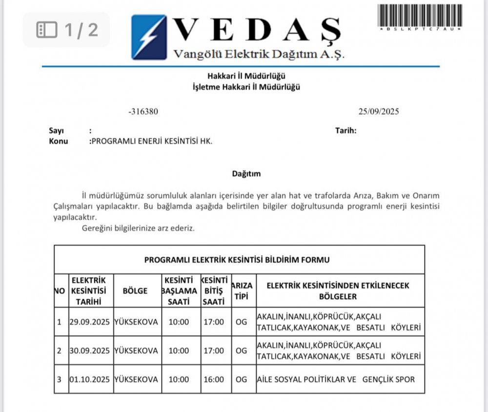 Vangölü Elektrik Dağıtım A.Ş. (VEDAŞ) Hakkari İl Müdürlüğü, Yüksekova ilçesinde bakım ve onarım çalışmaları nedeniyle 29 Eylül – 1 Ekim 2025 tarihleri arasında planlı elektrik kesintisi yapılacağını açıkladı.