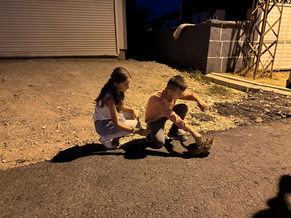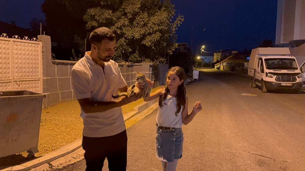 Bir aracın çarpıp kaçtığı kedi yavrusunu fark eden Narin, babasının da yardımıyla minik hayvanın hayatını kurtardı.