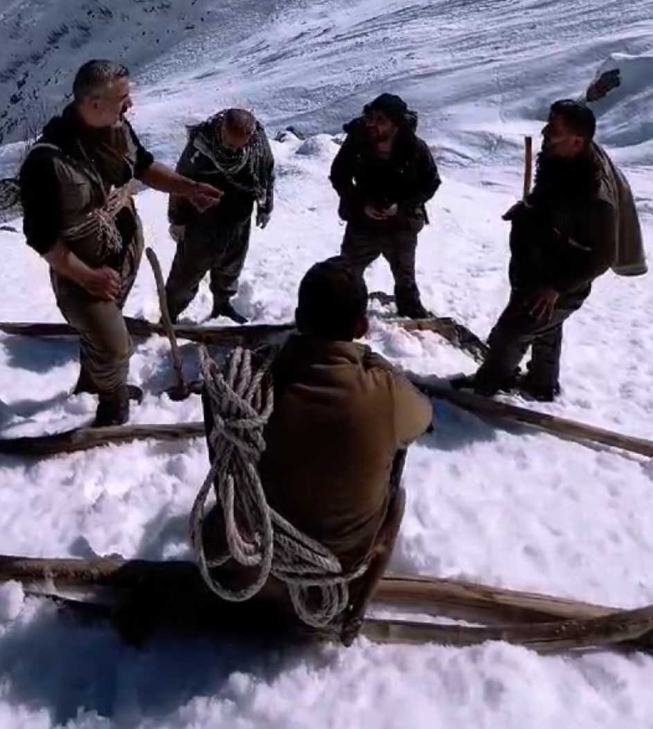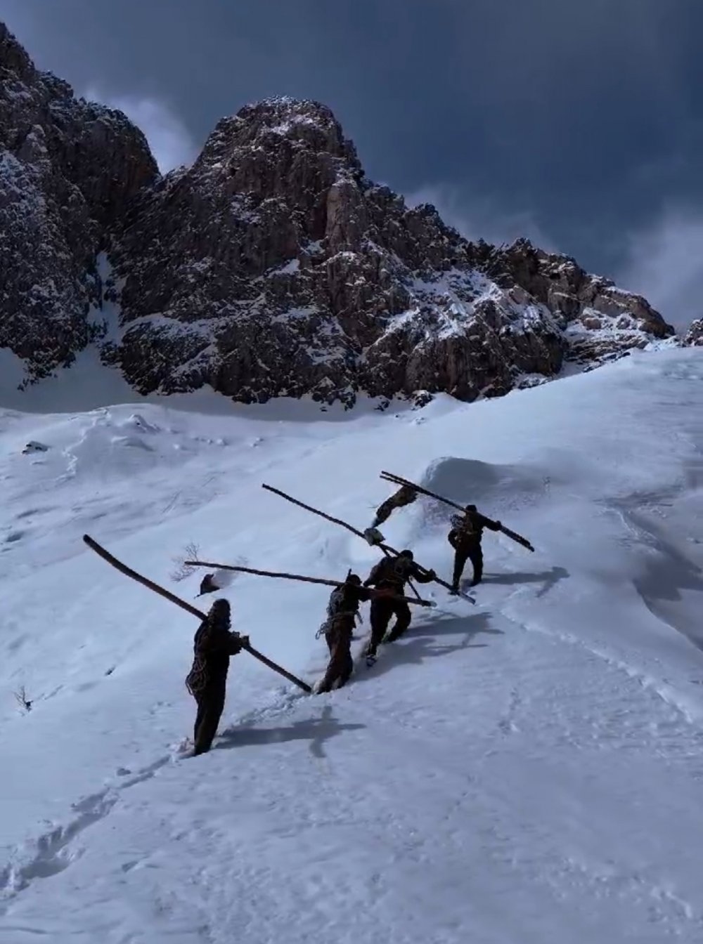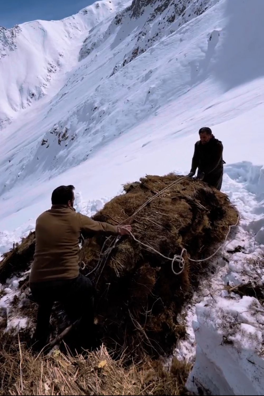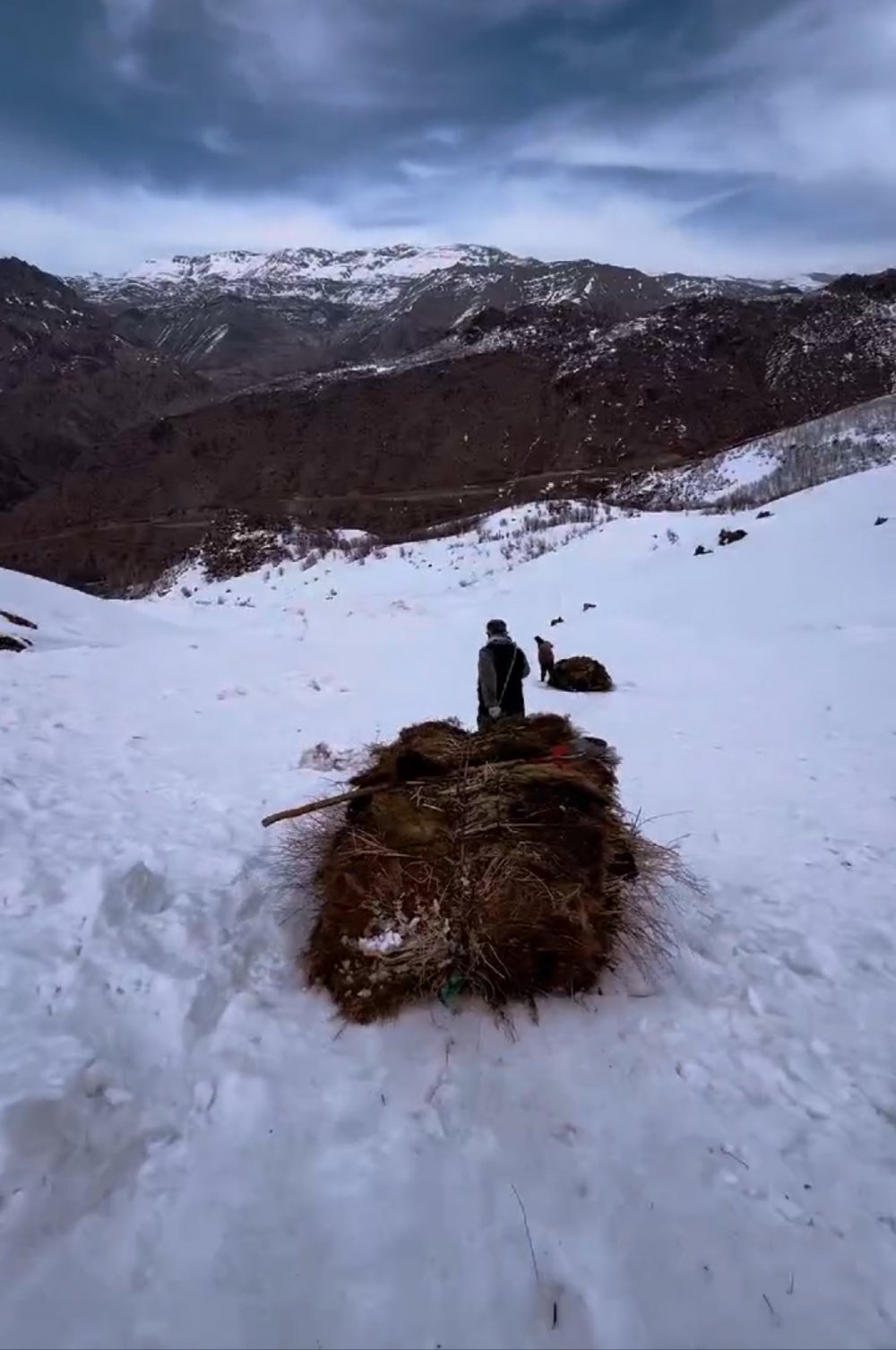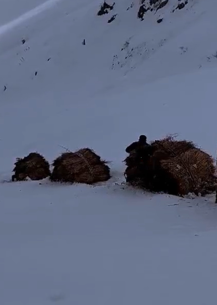 İlçenin Yeşiltaş (ŞITAZIN) köyü sakinleri, hayvanlarını beslemek için yaz aylarında 3 bin rakımlı dağlardan biçip biriktirdikleri ot yığınlarını karlı dağlardan kızak ve brandaya yükleyip 4 kilometrelik dik yamaçtan köylerine indiriyorlar.