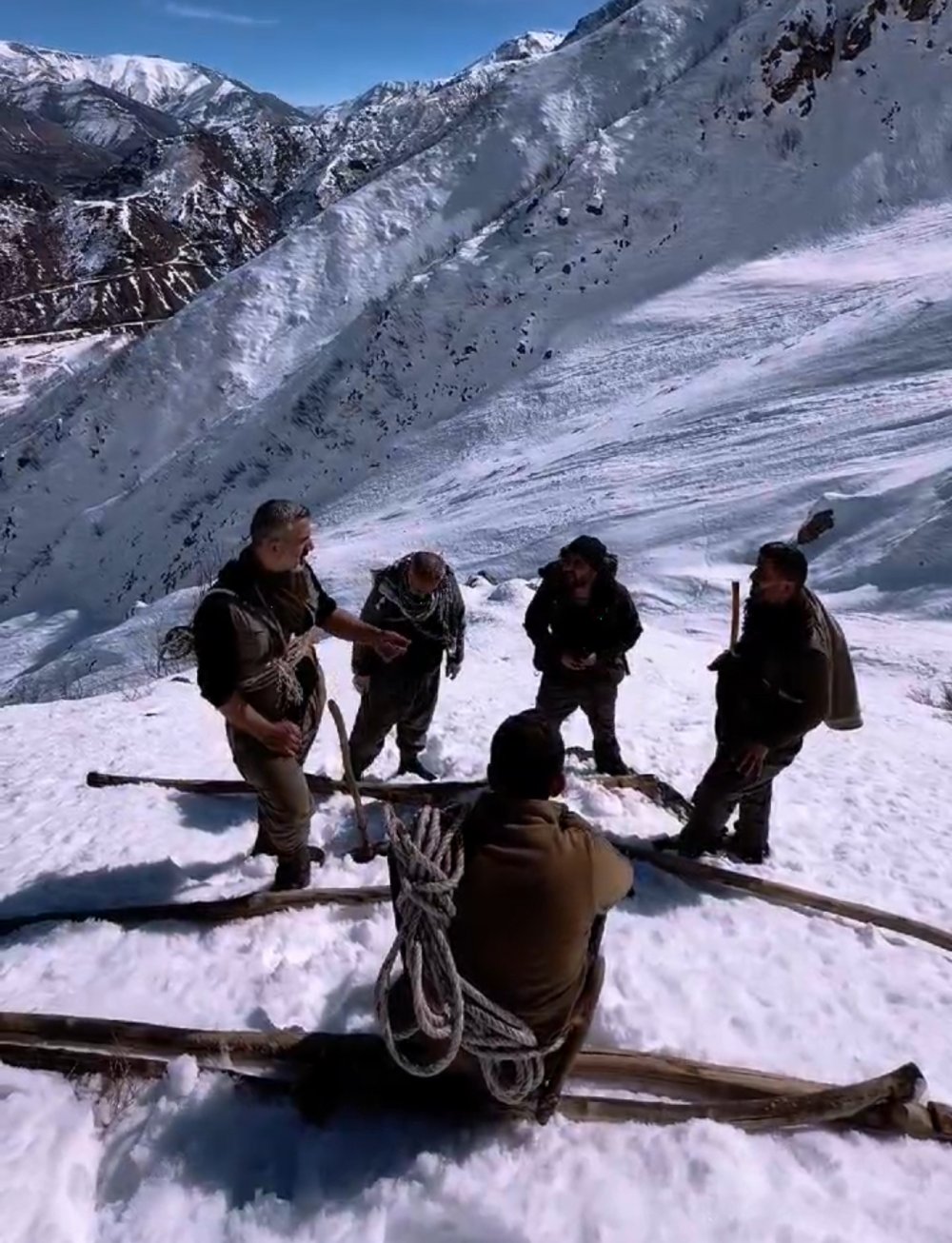 Yüksekova ilçesinde çiftçilikle geçimlerini sağlayan köylüler, yaz aylarında dağlarda istifledikleri otları çığ tehlikesine rağmen kızak ve branda üzerinde dik yamaçtan köye indiriyorlar.