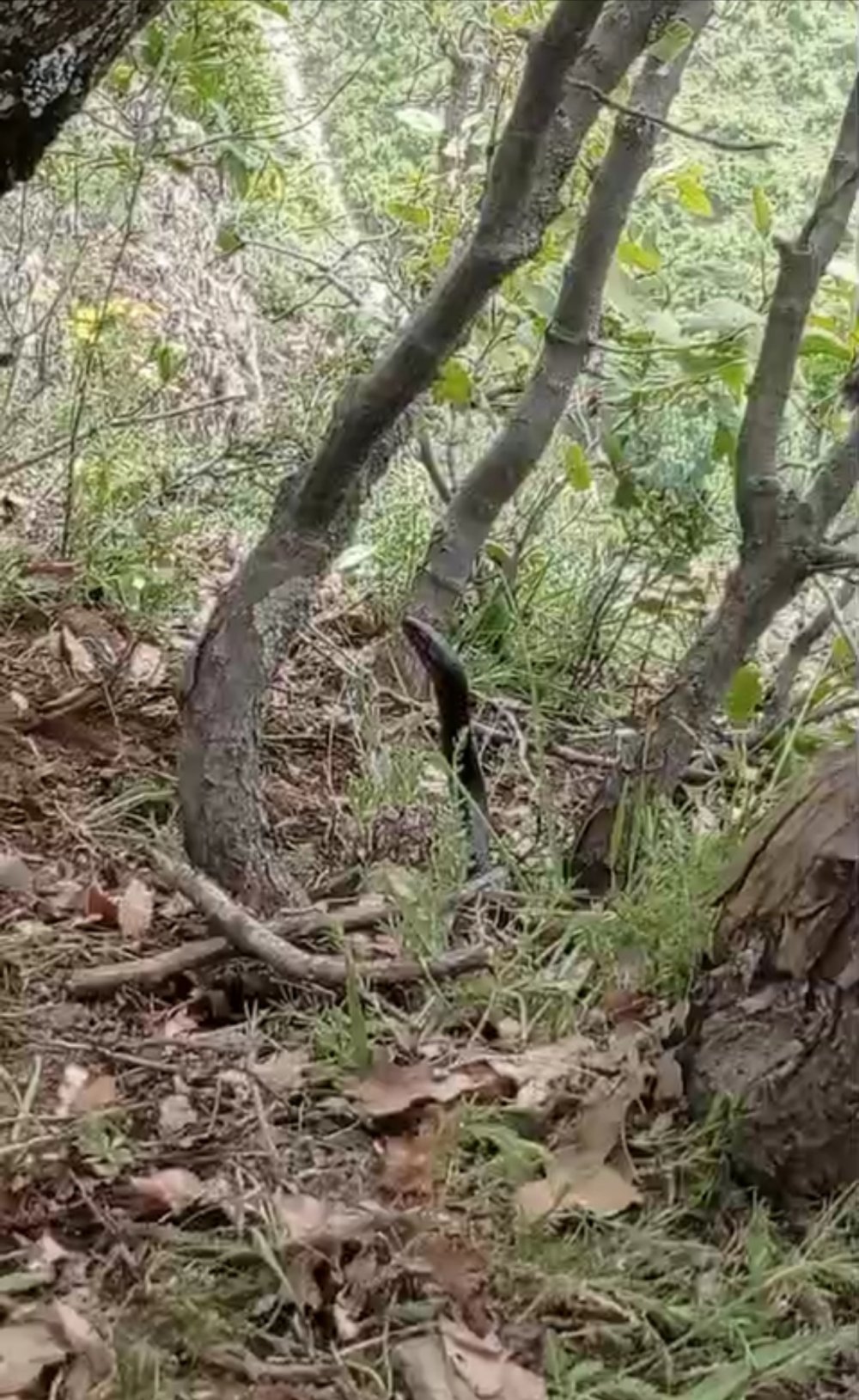 Bu büyüklükte bir yılanla ilk kez karşılaştığını belirten Nasır Çoruh, “Dağlık bir alanda geziyorduk. Karşımızda başını kaldırmış dev bir siyah yılan fark ettik. Gerçekten çok korktuk çünkü böyle bir yılanla ilk kez karşılaşmıştık. Hemen telefonumu çıkarıp kaydettim. Araştırmalarıma göre bu yılan türüne kara yılan deniyor. Bir süre sonra yılan gözden kayboldu” dedi.
