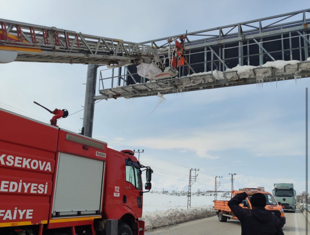Yüksekova Belediyesi İtfaiye Müdürlüğü ekipleri, ilçe genelinde etkili olan yağış sonrası enerji nakil hatlarında ve bina çatılarında oluşan buz kütlelerini temizlemek için yoğun mesai harcadı.