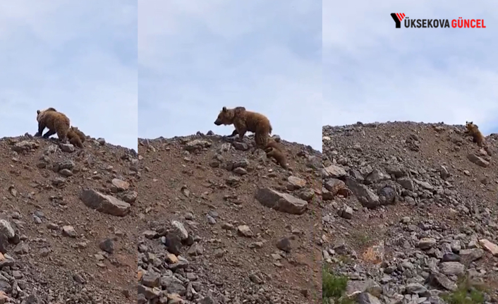 Yüksekova'nın Dağlıca köyünde, kış uykusundan yeni uyanan bir anne ayı ve iki yavrusu doğada yiyecek ararken görüntülendi.