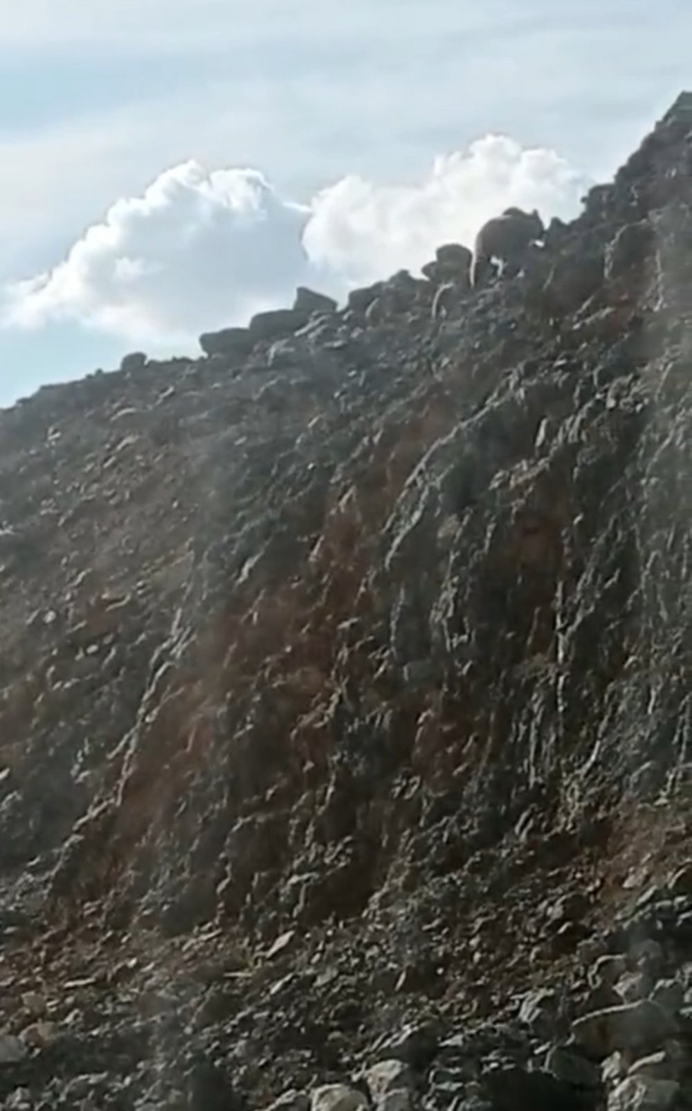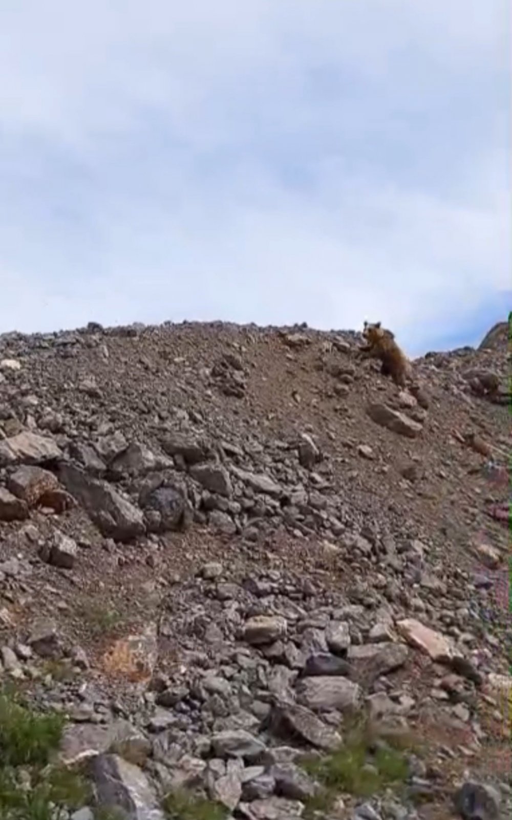 Yiyecek bulmak amacıyla dağlık alanda dolaşan ayılar, bir süre arayışlarına devam ettiler.