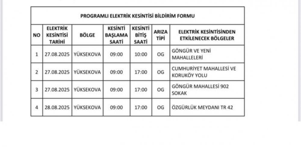 •    28 Ağustos 2025 Perşembe günü saat 09.00 - 17.00 arasında ise Özgürlük Meydanı TR 42 bölgesinde elektrik verilemeyecek.