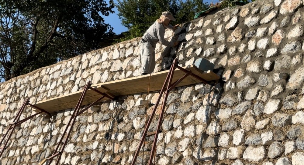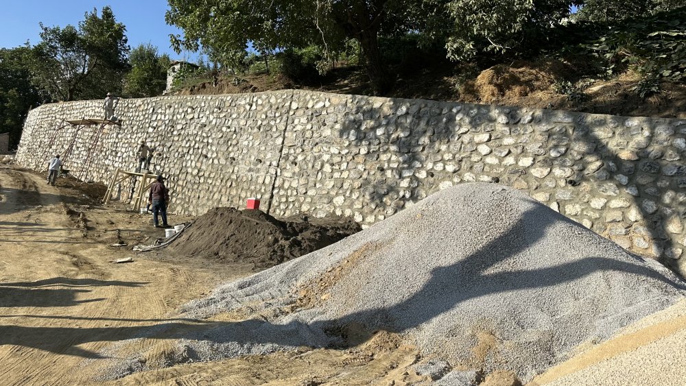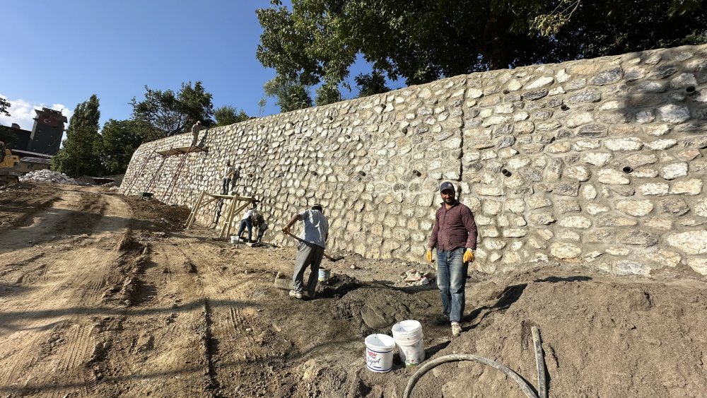 Yükleyici firma tarafından köy içinde 600 metre genişliğinde şehir merkezinden köy tarafından gelen sağ tarafına düşen duvar örme çalışmaları tüm hızıyla sürüyor.