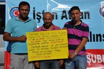 Antep'te bulunan TÜVTÜRK Doğu Taşıt A.Ş'ye ait Araç Muayene İstasyonu'nda çalışan 3 işçi, TÜMTİS'e üye oldukları gerekçesiyle işten çıkarıldı. 28 gündür işten atılan işçiler, her gün istasyon binası önüne gelerek, protesto eylemi gerçekleştiriyor. Günlerdir direnen işçiler, çeşitli eylemlerle kendilerine reva görülen durumu kabul etmeyeceklerini dile getiriyor. Söz konusu durumun kendisinin işten atılmasıyla başladığını belirten Ahmet Kılıç (33) adlı işçi, yaklaşık 2,5 yıldır istasyonda teknisyenlik yaptığını söyledi. Kılıç, bir ay önce işyeri müdürü tarafından çağırılıp, "Biz seninle çalışmak istemiyoruz. Yarın işe gelmene gerek yok. İstediğin saatte gel görüşelim" denilerek, işine son verildiğini söyledi. "Sen bundan 5-6 ay önce serviste küfür etmişsin" gibi bir gerekçe sunularak isten çıkartıldığını aktaran Kılıç, "İşte bazı bahaneler öne sürerek, iş hakkımızı fes etmek istediler. Ben sendikalı olduğum için beni işten çıkardılar. Çıkış kâğıtlarını bir gün önceden hazırlamışlardı. O kâğıtları imzalamamı istediler. Ben de alıp onları inceledim, bayağı yanlış şeyler vardı. 'Avukatıma başvurmadan ben bunu imzalamayacağım' dedim. Sonra onlarla bir defa daha görüştük. Bu sefer de gerekçe olarak, 'Sen sendikaya üye olmuşsun, neden bize söylemedin, söyleseydin biz de üye olurduk' diye benimle alay etmeye çalışıyorlardı. 'Bu işlerin nasıl olduğunu siz ben den daha iyi bilirsiniz' dedim. Durum sadece bunlarla bitmiyor. Bizim orada 24 TÜMTİS'li arkadaşımız var. Onlarla gidip konuşmak istedik, ama oraya da girmemize izin vermiyorlar" diye konuştu.