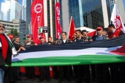 İstanbul'da da DİSK üyeleri, Levent'teki Yapı Kredi Plaza'da bulunan İsrail Konsolosluğu önünde, İsrail'in Filistin'e yönelik saldırılarını, ilan ettikleri "Filistin Halkı ile Dayanışma Günü"nde protesto etti. "Filistin halkı yalnız değildir" pankartı açan DİSK üyeleri, "Katil İsrail, Filistin'den defol", "Yaşasın halkların kardeşliği" sloganları attı. Filistin ve Türkiye bayrağı taşıyan DİSK üyeleri adına basın açıklaması yapan DİSK Genel Sekreteri Adnan Serdaroğlu, "Kimi haritalarda, Filistin devleti yer almamaktadır. Kimi haritalara göre Filistin Ortadoğu'dadır. Ancak Filistin bir toprak parçasından çok bir duygudur" dedi. ABD'de derilerinin rengi yüzünden baskı gören Afrikalıların yaşadığı mahallelerin, Güney Amerika'da ağaçları kesilen, ırmakları kurutulan dağ köylerinin, Türkiye'de ise hak ettiği maaşı alamayan işçilerin çalıştığı fabrikaların da Filistin olduğunu belirten Serdaroğlu, BM'ye İsrail işgalini durdurma çağrısı yaparak, AKP'ye de Kürecik'teki füze kalkanlarını kaldırması ve emperyalizmin değil Ortadoğu halklarının yanında olması yönünde uyarı yaptı. DİHA