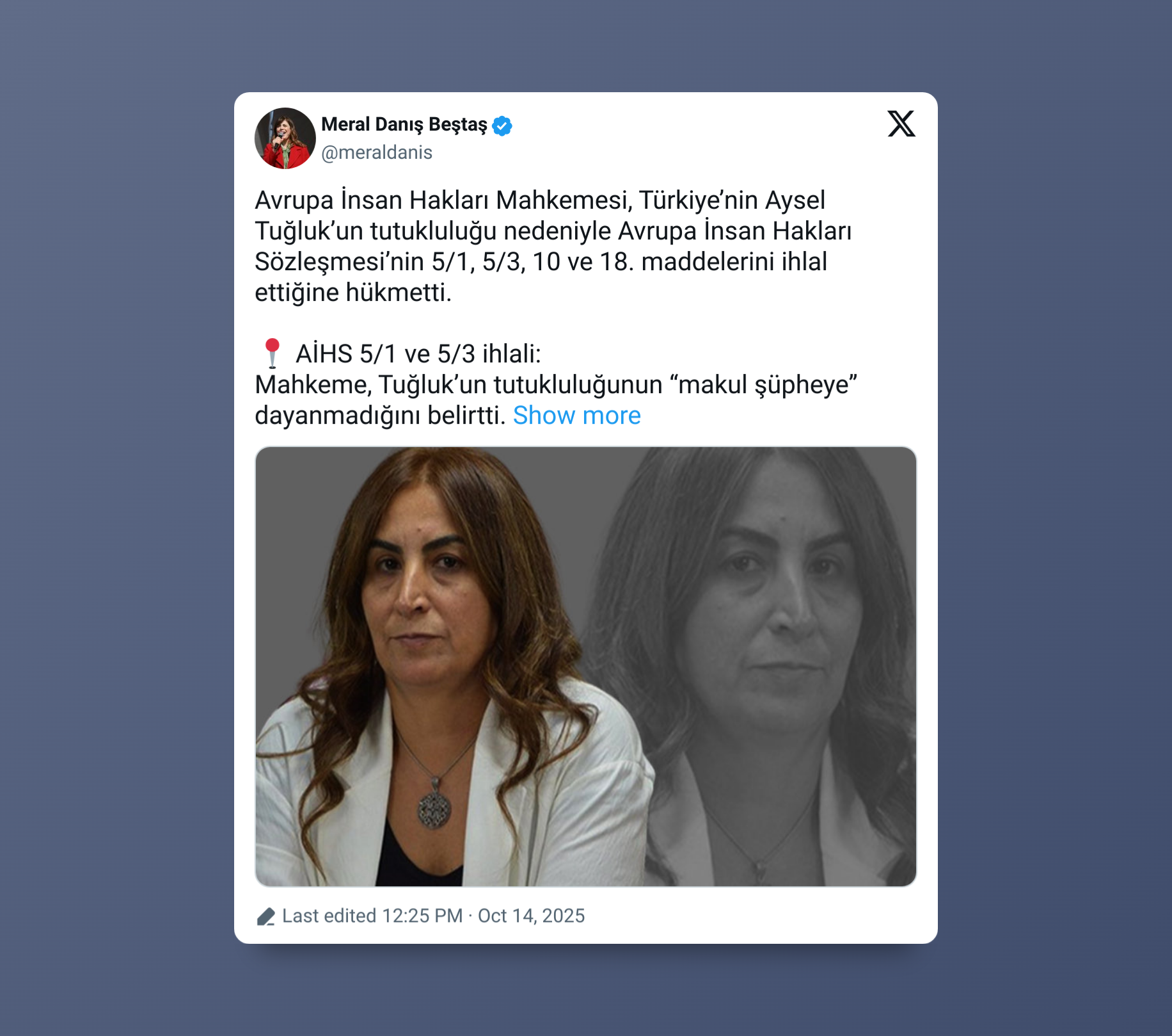 Kararın ardından X hesabından bir mesaj yayınlayan DEM Parti Erzurum Milletvekili Meral Danış Beştaş, "Aysel Tuğluk kararı, sadece bir kişi için değil; düşüncesi, kimliği ve sözü nedeniyle cezalandırılan herkes için verilmiş bir 'adalet kararıdır.' Ancak öte yandan bu karar, Aysel Tuğluk'un yaşamından çalınan yılları, yitirdiği sağlığını ve daha nicesini hatırlatmıştır! Geç gelen adaletin bir insanın nasıl büyük zararlara maruz kaldığını ortaya koymuştur! Adaletin tecelli etmesi için daha kaç ihlal gerekiyor! Ya da daha kaç insanın hayatının yok edilmesi bekleniyor!" ifadelerini kullandı: