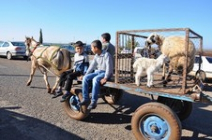 Yer, Urfa'nın Siverek ilçesi. Bir yurttaş, at arabasının üzerine yerleştirdiği tel kafes içerisinde bir koyun ve kuzusunu taşınıyor. Çocuklar da tel kafesin yanında koyun ve kuzuya eşlik ediyor. DİHA