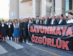 Duruşmayı izlemek için 27 farklı ülkeden ve Türkiye'nin birçok barosundan gelen avukatlar İstanbul Adliyesi önünde "Savunmaya Özgürlük" pankartı açtı.
