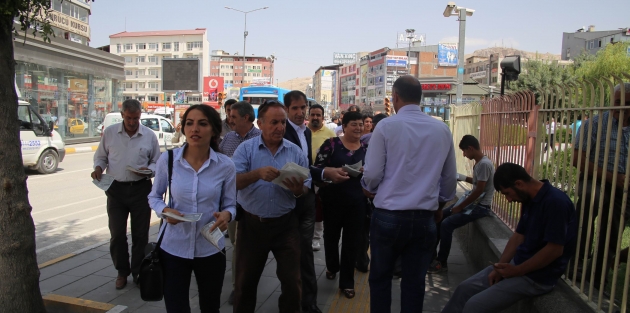 HDP Eş Genel Başkanı Selahattin Demirtaş'ın katılımıyla yarın Van'da gerçekleştirilecek "Size savaş yaptırmayacağız" mitingi için kent halkına bildiri dağıtıldı.