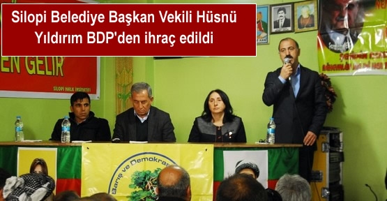 BDP Genel Merkezi, Silopi Belediye Başkan Vekili Hüsnü Yıldırım'ı ihraç etti. İhraç kararını yapılan basın açıklamasıyla ilan eden BDP Muş Milletvekili Demir Çelik, kendi başına hareket etmeye göz yummayacaklarını ve Hüsnü Yıldım'a bir kez daha fırsat vermenin kendilerini aldatmak olduğuna karar verdiklerini belirterek, Yıldırım'ın BDP'den ihraç edildiğini açıkladı.