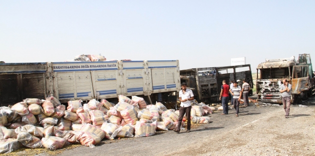 Diyarbakır-Batman Karayolu'nun Bismil ilçesine bağlı Köseli köyü mevkiinde yol kapatan HPG'liler, 3 kamyonu ateşe verdi.