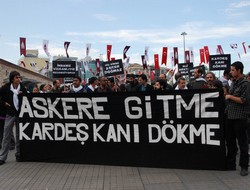 Boyunlarına barışı simgeleyen beyaz renkli şallar takarak yürüyen vicdani retçiler, "İtaatsizlik özgürleştirir", "Ne okula ne kışlaya liseliler isyana", "Askere gitme kardeşkanı dökme" pankartları açtı. "İnsanız vicdanlıyız reddediyoruz", "Bijî biratiya gelan", "Savaşta barışta militarizm öldürür" dövizleri taşıyan grup, "Reddet diren hayır de askere gitme", "Biz Ordu'ya sadece fındığa gideriz", "Hiç kimse asker doğmaz", "Her insan bebek doğar", "Ne mutlu insanım diyene" sloganları attı. İstiklal Caddesi'nde birkaç kişi, "Her Türk asker doğar" sloganları atarak, gerginlik yaratmaya çalıştı. Polisler grubu uzaklaştırdı.