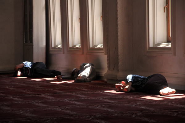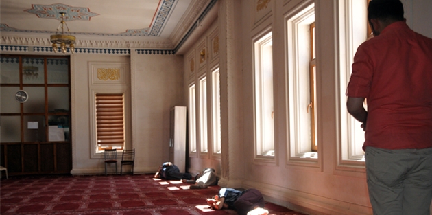 Hava sıcaklığının 25 derecenin üzerine çıktığı Yüksekova'da oruç tutan bazı vatandaşlar, öğlen vakti namaz kıldıktan sonra cami içersinde uyuyarak iftarı ve sonraki namaz vaktini bekliyor. Vatandaşların bu hali ilginç görüntülere yol açıyor.