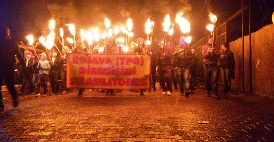 Şırnak'ın Cizre ilçesinde, dün akşam geç saatlerde Nur Mahallesi Botaş Caddesi üzerinde bir araya gelen yüzleri maskeli yüzü aşkın genç, Rojava halkının kazanımlarına destek vermek ve Kürt bölgesine yapılan saldırıları kınamak amacıyla meşaleli yürüyüş gerçekleştirdi.