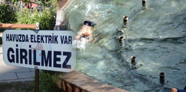 Hava sıcaklığının zaman zaman 35 dereceyi bulduğu Van'da sıcaktan bunalan yaşları 5 ile 13 arasında değişen çocuklar, elektrik kablolarıyla dolu havuzda tehlikelere ve 'Havuzda elektrik var girilmez' yazısına aldırmadan süs havuzuna girererek serinliyor./Dha