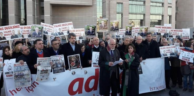 – Cumhuriyet gazetesi çalışanlarının yargılandığı davaya bugün İstanbul Adliyesi 27’nci Ağır Ceza Mahkemesi’nde devam edilecek. Duruşma öncesi adliye önünde İstanbul, Ankara baroları ile gazeteciler basın açıklaması yaparak, tutuklamalara son verilmesini talep ettiler.