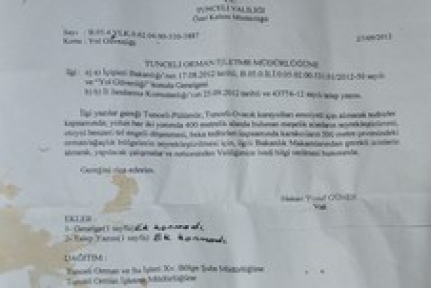 Dersim Jandarma Komutanlığı'nın, 29 Ocak 2013 Dersim Orman İşletme Müdürlüğü ile yaptığı "Eleman görevlendirilmesi" konulu yazışmada ise, Munzur ve Pülümür vadilerinden geçen yolların çevrelerinde bulunan ormanların her iki tarafından 400 metre ormanların seyreltilmesi, güzergah üzerinde bulunan karakolların çevresinin ise 500 metre seyreltilmesi talep ediliyor. Dersim Orman İşletme Müdürlüğü'nün 15.01.2013 gün ve 43950897.1.12.24.00.01/188 sayılı yazısına göre, Dersim-Pülümür-Ovacık karayolları "emniyeti" için alınacak tedbirler kapsamında yolun her iki yanında 400 metrelik alanda meşelik alanların seyreltilmesi ile güzergah üzerinde bulunan karakolların 500 metre çevresindeki orman örtüsünün seyreltilmesi talep edildiğinden, bölgeyi iyi bilen, komisyonda görev yapacak personel bilgilerinin gönderilmesinin istenildiği anlaşılıyor. Aynı belgede, İl Merkez Jandarma Komutanlığı'nda görevli J. Bçvş. Zeki Taşkıran ve Uzm. J. IV. Kad. Çvş. Veysel Satılmış'ın konu ile ilgili görevlendirildiği belirtiliyor. Öte yandan aynı yazışmanın Dersim Valiliği ile de yapıldığı öğrenildi.