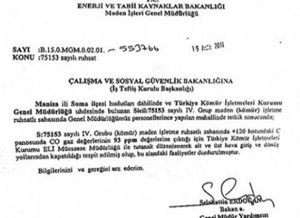 Enerji Bakanlığı ile Çalışma Bakanlığı arasında bu dönemde, sahadaki gaz seviyesine ilişkin bazı yazışmalar yapıldı. Örneğin, Ege Linyitleri Genel Müdürlüğü maden ocağındaki gaz seviyesinin 93 ppm’e yükseldiğine yönelik tespitini 2011 yılının Ekim ve Kasım aylarında Enerji Bakanlığı’na bağlı ekipler tarafından tespit edildi. Maden İşleri Genel Müdürlüğü de konuyla ilgili olarak TKİ ile Çalışma ve Sosyal Güvenlik Bakanlığı Teftiş Kurulu’na çeşitli yazılar göndererek gereğinin yapılmasını istedi.