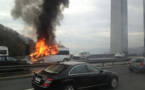Fatih Sultan Mehmet Köprüsü üzerinde seyir halinde olan bir servis aracında öğrenilemeyen bir nedenden ötürü yangın çıktı. Köprünün girişinde çıkan yangın nedeniyle FSM Anadolu-Avrupa yakası trafiğe kapatılırken, olay yerine sevk edilen itfaiye ekipleri yangına müdahale ediyor.DİHA