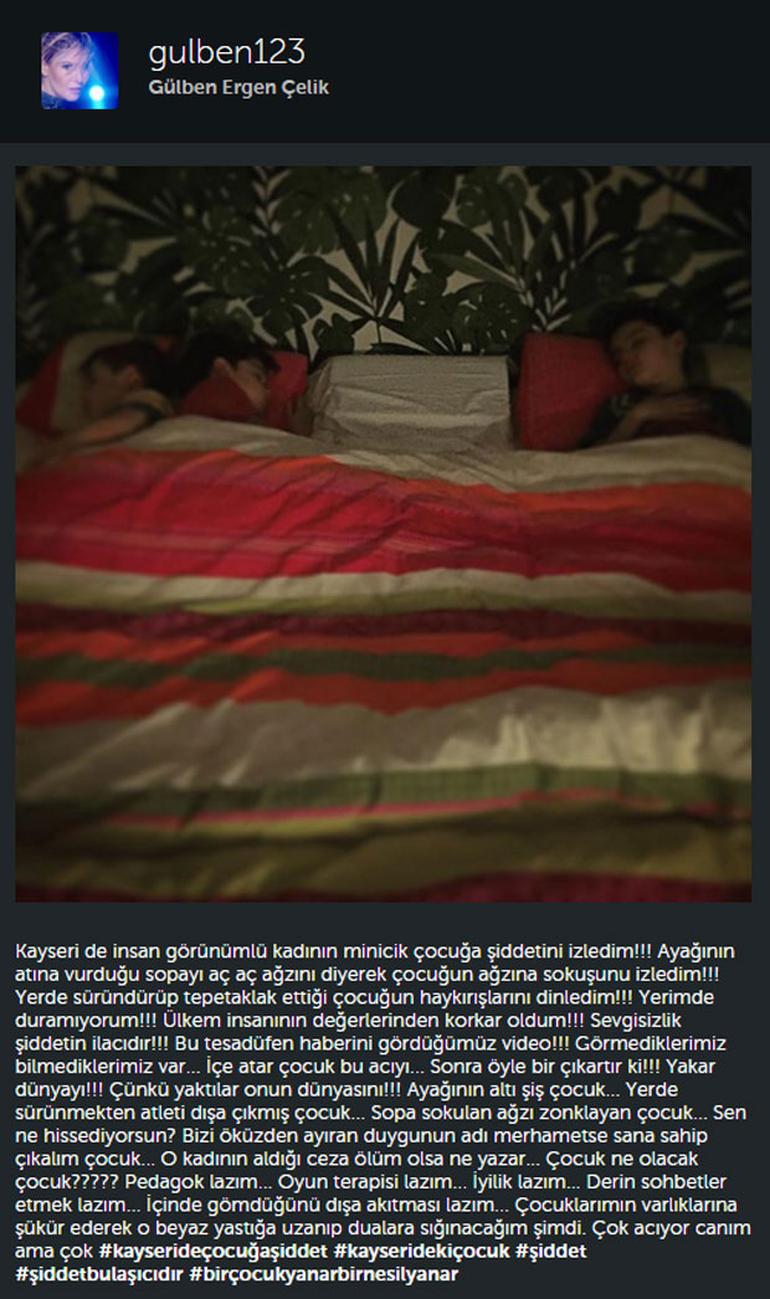 "Kayseri'de insan görünümlü kadının minicik çocuğa şiddetini izledim! Ayağının atına vurduğu sopayı... 'aç, aç ağzını' diyerek çocuğun ağzına sokuşunu izledim! Yerde süründürüp tepetaklak ettiği çocuğun haykırışlarını dinledim! Yerimde duramıyorum! Ülkem insanının değerlerinden korkar oldum! Sevgisizlik şiddetin ilacıdır! Bu tesadüfen haberini gördüğümüz video! Görmediklerimiz bilmediklerimiz var... İçe atar çocuk bu acıyı... Sonra öyle bir çıkartır ki, yakar dünyayı! Çünkü yaktılar onun dünyasını! Ayağının altı şiş çocuk... Yerde sürünmekten atleti dışa çıkmış çocuk... Sopa sokulan ağzı zonklayan çocuk... Sen ne hissediyorsun? Bizi öküzden ayıran duygunun adı merhametse sana sahip çıkalım çocuk... O kadının aldığı ceza ölüm olsa ne yazar? Çocuk ne olacak çocuk? Pedagog lazım... Oyun terapisi lazım... İyilik lazım... Derin sohbetler etmek lazım... İçinde gömdüğünü dışa akıtması lazım... Çocuklarımın varlıklarına şükür ederek o beyaz yastığa uzanıp dualara sığınacağım şimdi. Çok acıyor canım ama çok..."
