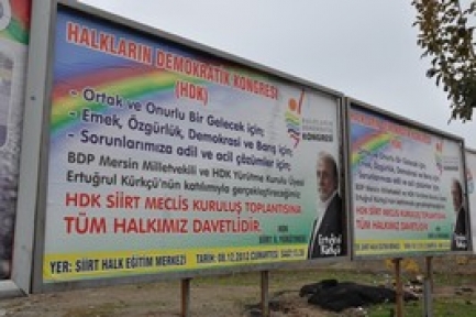 Uzun süredir örgütleme çalışmalarının devam ettiği Siirt'te HDK Siirt İl Meclisi'nin yarın kuruluşunu ilan edeceği açıklandı. BDP Mersin Milletvekili Ertuğrul Kürkçü'nün de katılacağı toplantıya katılım için kent merkezinde billboardlarda afişler asıldı.