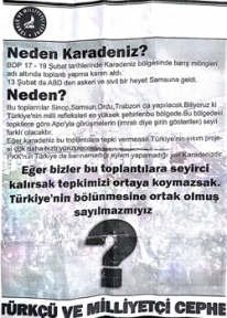 Samsun Halkevi'nin kapısının altına bırakıldığı belirtilen bildiride,Facebook üzerinden ve sosyal medyada örgütlendiği anlaşılan 'Türkçü ve Milliyetçi Cephe'nin adı yer alıyor. Logosunda 'Bozkurt' amblemi bulunan grubun bildirisinde, "BDP'nin 17-19 Şubat'ta Karadeniz'de barışmitingleri yapacağı" söylenerek,"Neden Karadeniz?" diye soruluyor.