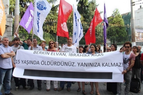 Yası simgeleyen siyah bir bandın yer aldığı, “ Berkin Elvan, İbrahim Aras 15 yaşında öldürdüğünüz yanınıza kalmaz” yazılı pankartı açan emekçiler, hep bir ağızdan “Çocukların katili AKP devleti”, “Katil devlet hesap verecek”, “ Katillerin hesabını emekçiler soracak”, “ Savaşa hayır barış hemen şimdi” sloganları attı. Açıklamayı KESK Şubeler Platformu dönem sözcüsü Fadime Kavak okudu.