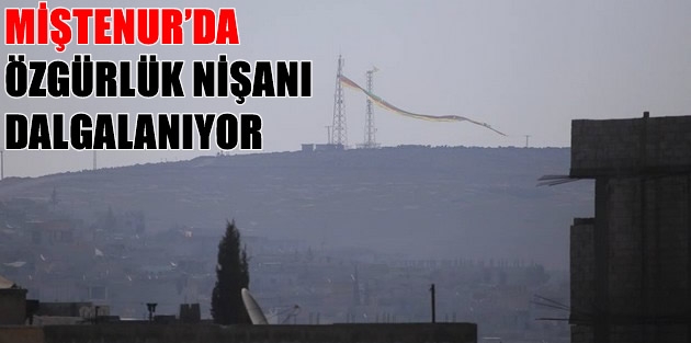 YPG/YPJ savaşçıları özgürleştirdikleri Miştenur Tepesi’nde ki verici direklerine 75 metrelik kesk, sor û zer renklerinden oluşan dev TEVDEM bayrağı astı.
