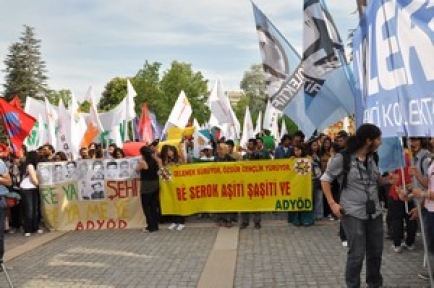 Konuşmanın ardından öğrenciler kortejler eşliğinde Devrim Stadyumu'na doğru yürüyüşe geçti. "ODTÜ direniyor devrime yürüyor" ortak pankartının yanı sıra, "Barışın sesi olup barışı haykıracağız", "Riya şehid riya me ye", "Bê Serok aşitî şaşitî ye", "Dağın sözü göğün gücü var" pankartları taşındı. Öte yandan ADYÖD'lü öğrencilerin taşıdığı pankartta, Ferhat Kurtay, Haki Karer, İbrahim Kaypakkaya'nın posterleri de yer aldı. Birçok dövizin taşındığı yürüyüşte sık sık, "Eşitlik kardeşlik Kürt ulusuna özgürlük", "Her der Dicle her der berxwedan", "Kahrolsun kapitalist modernite", "Her yer Dicle her yer direniş", "Devrimci tutsaklar onurumuzdur" ve "Şehit namirin" sloganları atıldı.