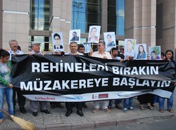 Adliye önünde "Rehineleri bırakın müzakerelere başlayın" pankartı açıldı.