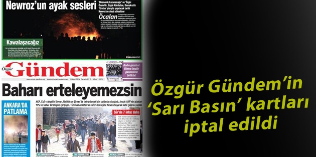Başbakanlık Basın Yayın ve Enformasyon Genel Müdürlüğü (BYEGM), Özgür Gündem gazetesi çalışanlarının “Sarı Basın” kartlarını iptal etti.