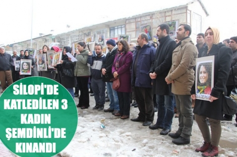 Silopi’de önceki gün katledilen Kürt kadın siyasetçiler DBP PM üyesi Sêvê Demir, KJA aktivisti Fatma Uyar veSilopi Halk Meclisi Eş başkanı Pakize Nayır için KJA, DBP ve HDP tarafından Şemdinli HDP binası önünde basın açıklaması düzenlendi. Basın açıklamsında katliam kınandı.