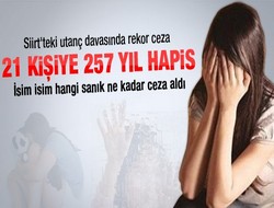 Siirt"teki "utanç" davasında, ilköğretim öğrencisi 4 kız çocuğuna cinsel istismarda bulunan ve aralarında bakkal, tuhafiyeci, kantinci, okul müdür yardımcısı ile kamu görevlilerinin olduğu 21 sanığa, 257 yıl hapis cezası verildi.
