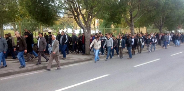 MANİSA'nın Soma İlçesi'ndeki Eynez Maden Ocağı'nda çalışan 200 madencinin bu ay ücretlerini alamadıkları gerekçesiyle dün başlattıkları eylem bugün de sürüyor. Cengiz Topel Meydanı'nda toplanan madenciler, sloganlar eşleğinde yürüyüşe geçti. İlçede tur atacakları belirtilen işçileri polis uzaktan takip ediyor.