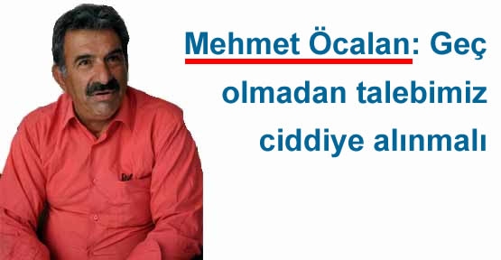 PKK Lideri Abdullah Öcalan'ın kardeşi Mehmet Öcalan, Abdullah Öcalan'ın sağlık durumu için aile olarak avukatları aracılığıyla gerekli müracaatları yaptıklarını belirterek, "Hastalık ciddi bir şeydir. Bu talebimiz ciddiye alınmalıdır. Yarın geç olabilir, hemen şimdi harekete geçilmelidir" dedi.