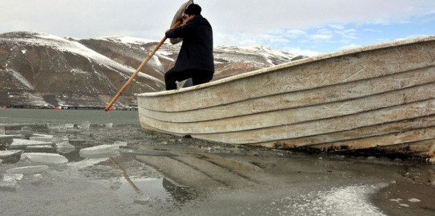 Yaz aylarında 12 bin hektarlık bir alanı sulamak için kullanılan baraj gölünde aynı zamanda kafes balıkçılığı da yapılıyor. Soğuklarla birlikte barajın içinde bulunan tekneler ve kafesler, yaklaşık 15 santimetre kalınlığındaki buz kütlesine gömüldü. Balıkçılar buz kütlesini kırarak teknelerini çıkarmaya çalışıyor./Dha