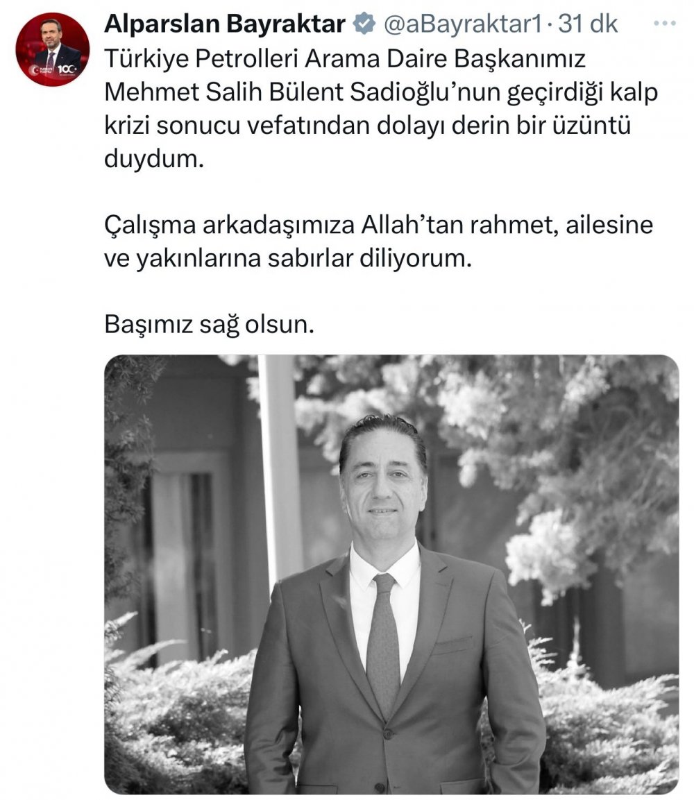 Enerji ve Tabii Kaynaklar Bakanı Alparslan Bayraktar X hesabında yaptığı açıklamada, “Türkiye Petrolleri Arama Daire Başkanımız Mehmet Salih Bülent Sadioğlu'nun geçirdiği kalp krizi sonucu vefatından dolayı derin bir üzüntü duydum. Çalışma arkadaşımıza Allah'tan rahmet, ailesine ve yakınlarına sabırlar diliyorum. Başımız sağ olsun” ifadelerini kullandı.
