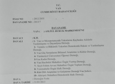Kürt işadamlarına yönelik hazırlanan ve BDP’nin “Varlık vergisi” ile “soykırım yasası” olarak tanımladığı, yine birçok çevrenin sivil toplum örgütlerini hedef alacağı yönünde eleştirdiği “Terörizmin Finansmanının Önlenmesi Hakkında Kanunun" Cumhurbaşkanı Abdullah Gül tarafından onanmasından hemen sonra savcılar harekete geçti. Van Cumhuriyet Savcısı Canip Cihangir emniyetin yaptığı araştırmalar neticesinde gizli tanık beyanlarına dayandırarak hazırladığı iddianame ile aralarında kadın dernekleri ve Kürtçenin gelişmesi için kurulan derneklerin de bulunduğu 10 derneğin PKK ile bağlantılı faaliyetlerde bulundukları gerekçesiyle kapatılması talebinde bulundu. Savcılığın iddianamesi Van Asliye Hukuk Mahkemesi’nce de kabul edildi.