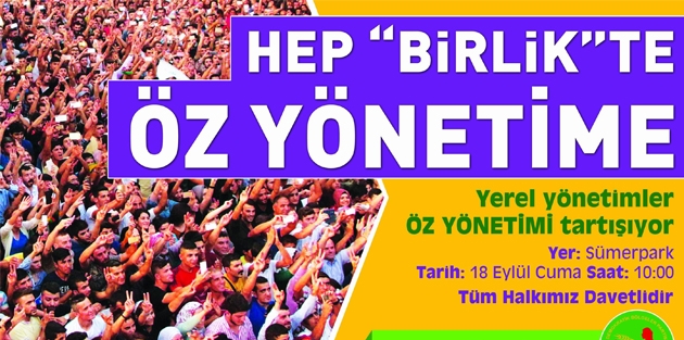 Devletin bilinçli bir şekilde "kriminalize" etmeye çalıştığı, yine şiddet olgusuyla kamuoyuna yansıtmaya çalışarak kırmaya çalıştığı "özyönetim" konusunda, DBP Yerel Yönetimleri önemli bir program oluşturarak "özyönetim" fikriyatını tartışmaya açıyor. 18-19 Eylül'de Diyarbakır Sümerpark'ta "Yerel Yönetimler Özyönetimi tartışıyor" başlığı ve "Hep birlikte özyönetime" sloganı ile gerçekleşecek programda, "özyönetim" olgusu; eğitim, sağlık, ekonomi, kültür, ekoloji, sivil savunma başta olmak üzere tüm başlıklarıyla ve özellikle yerel yönetimler boyutuyla tartışmaya açılacak.
