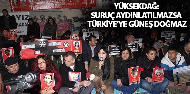 Eylemde HDP Eş Genel Başkanı Figen Yüksekdağ, “Suruç Karanlık sürecin başlangıç tarihidir. Eğer sorumlular korunur, gerçekler yalanlarla kapatılmaya devam ederse, Türkiye'ye güneş doğmaz. Bu ülkede gerçeğe ulaşmak zor. Gerçeğe ulaşmak isteyenler vuruluyor, katlediliyor. Bu zulmün, karanlığın ortasında halkların eşitliğinin, kardeşliğinin, barışının olduğunu söyleyenler katlediliyor" diye konuştu.