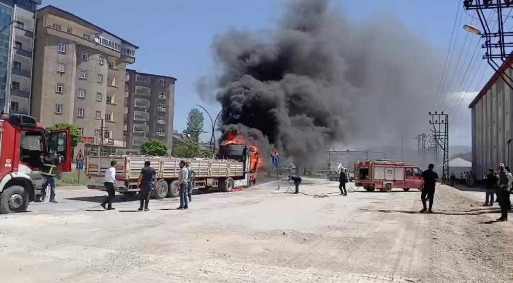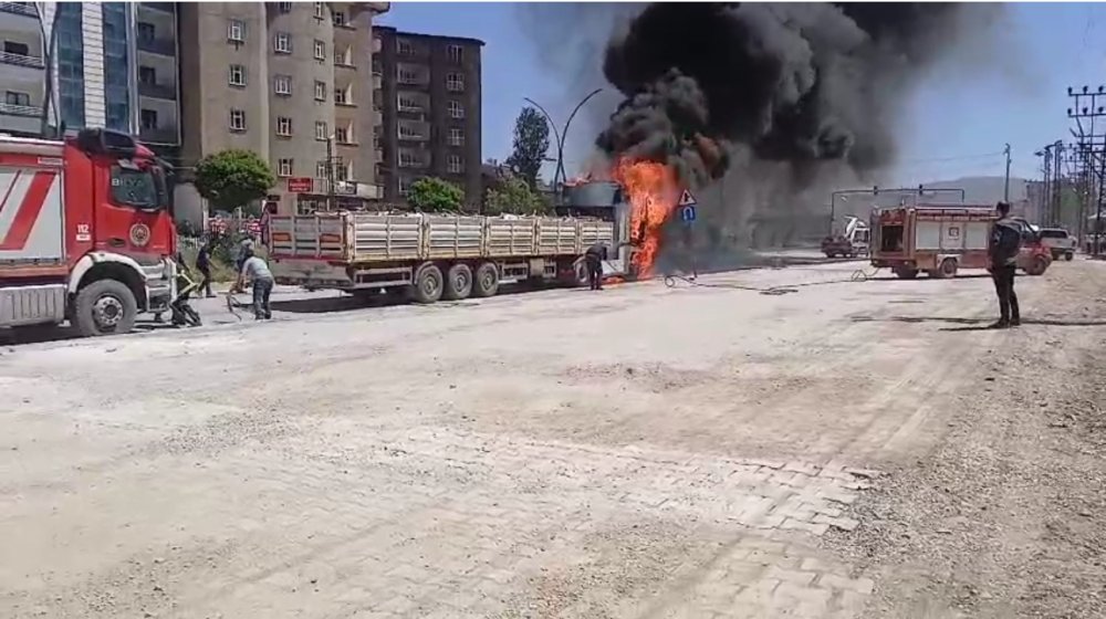 Yüksekova iİpekyolu üzerinde seyir halindeki maden yüklü bir tır, motor kısmından çıkan yangın sonucu alev aldı.