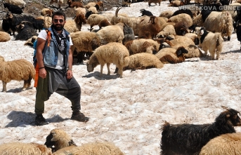 Yüksekova'da koyunlar sıcak havada karlı yamaçlarda serinliyor