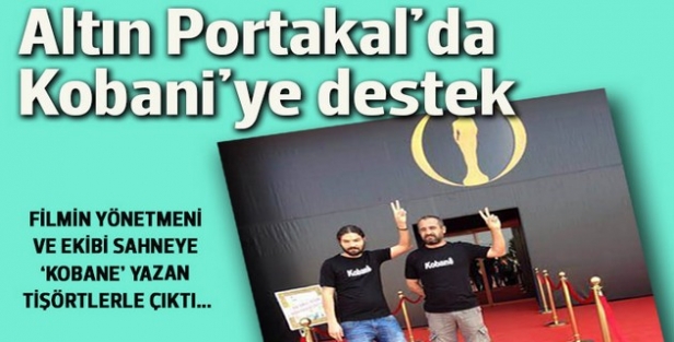 Altın Portakal Film Festivali'nde dün akşama Kobani damgasını vurdu. Yönetmenliğini Murat Eroğlu'nun yaptığı "Şafakla Dönenler" filminin ekibi sahneye "Kobani" tişörtleriyle çıkarak destek eylemi yaptı.