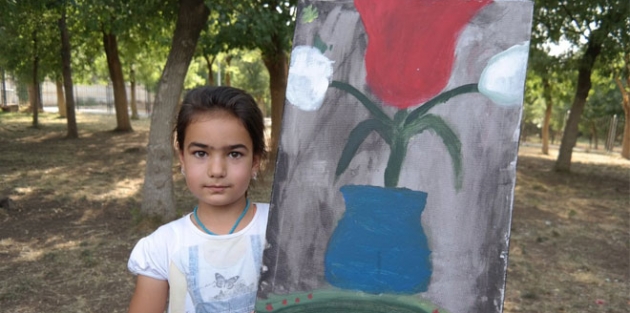 Süleymaniyeli ressam Dılşad Quhestanî de atölye süresince çocuklara resim ve boyama dersleri verirken, fotoğraf çekmeyi ve resim çizmeyi öğrenen çocukların ürünleri, Yenişehir ilçesi Fidanlık Alanı’ndaki Ezidî Kampı’nda sergilendi.